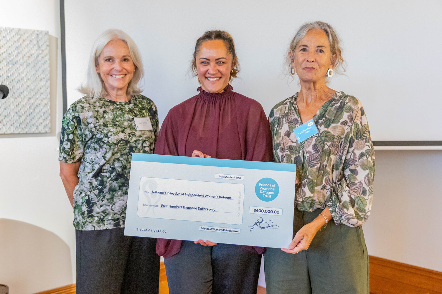 The incredible success of our event means that we were able to present Naomi Ogg, CEO, Women’s Refuge NZ with a record breaking $400,000 donation from the proceeds of the 2025 exhibition. Photo: Judy Bailey, Naomi Ogg and Rachel Brebner.